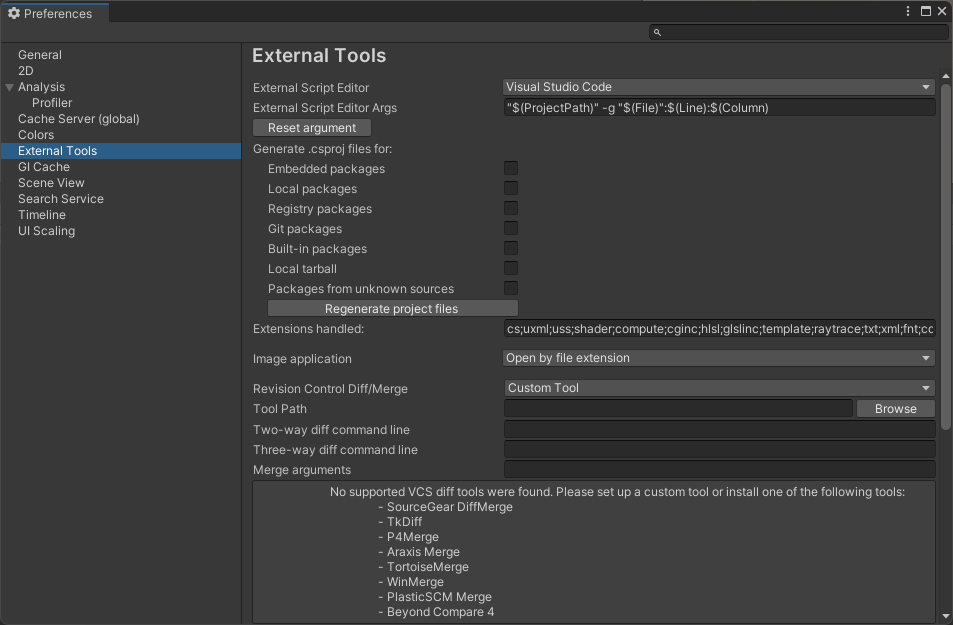 위치는 유니티 > Edit > Preference > External Tools > External Script Editor 항목에서 Visual Studio Code를 선택해 줍니다.