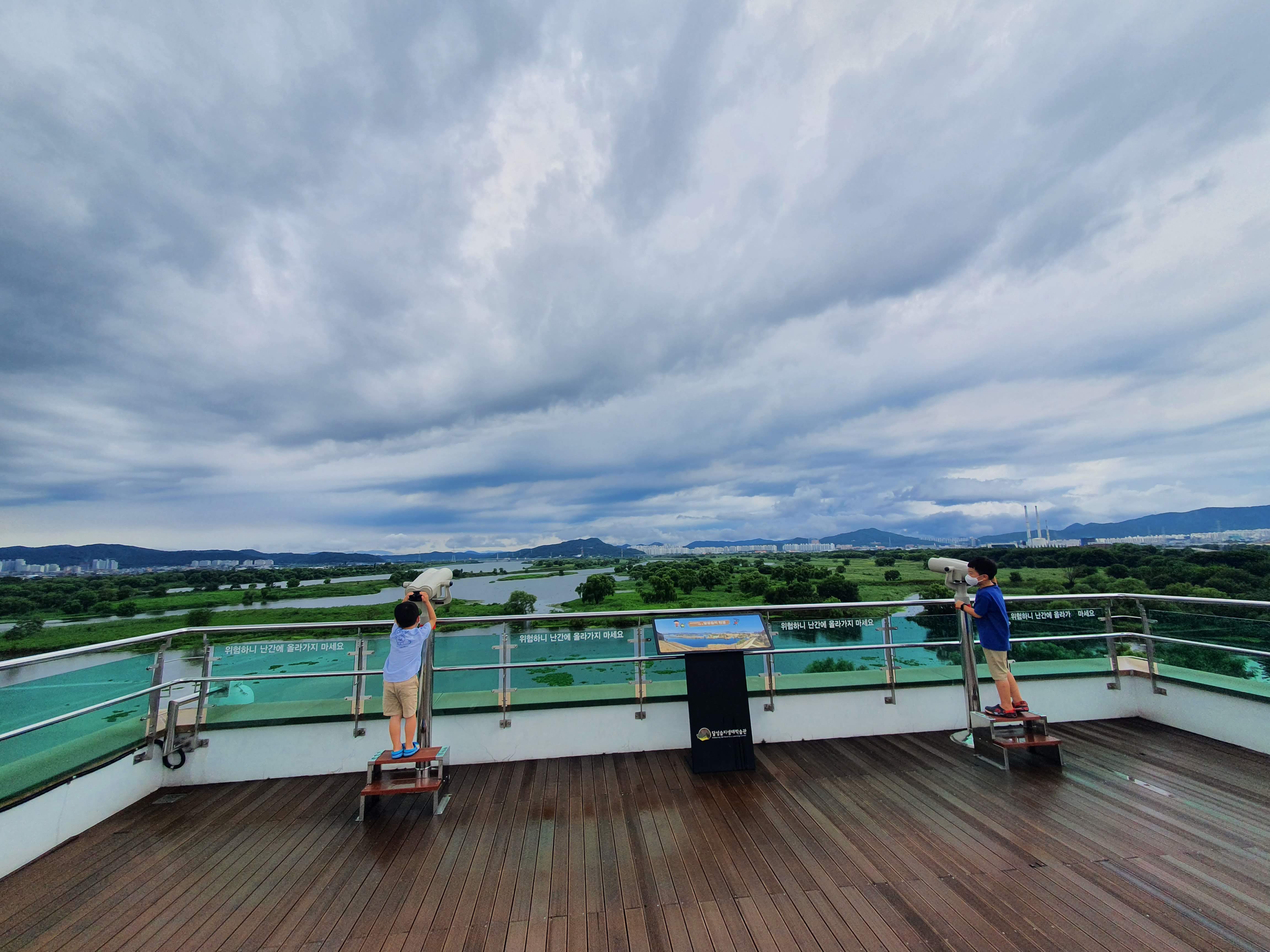 장대 같이 쏟아지던 비가 그치고 하늘이 개이기 시작하는걸 보고 아이들과 생태 체험관 옥상에 올라가서 잠시 달성 습지 전경을 보았는데, 비가 많이 쏟아져서 그런지 정말 깨끗하게 멀이 잘 보였습니다.